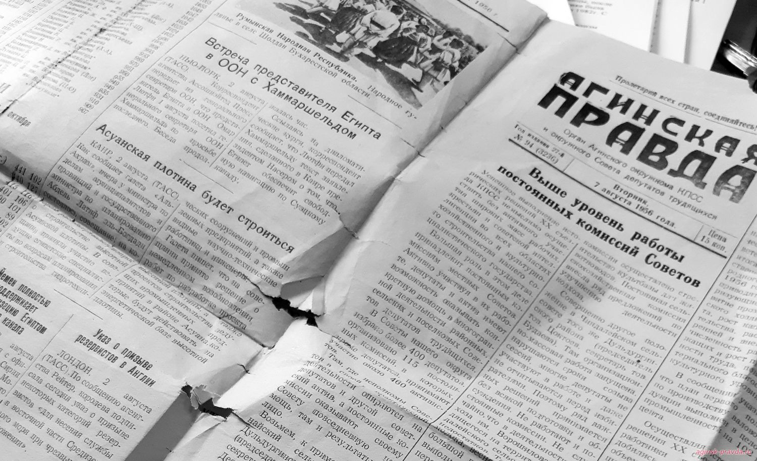 И сегодня у нас уже есть первый участник. Им оказалась жительница поселка Агинское Галина Константиновна Смолина (Бутина), являющаяся нашей постоянной читательницей с 1956 года. Она представила на конкурс экземпляр газеты «Агинская правда» от 7 августа 1956 года. Мы решили полистать страницы этого номера и вернуться на миг в прошлое.