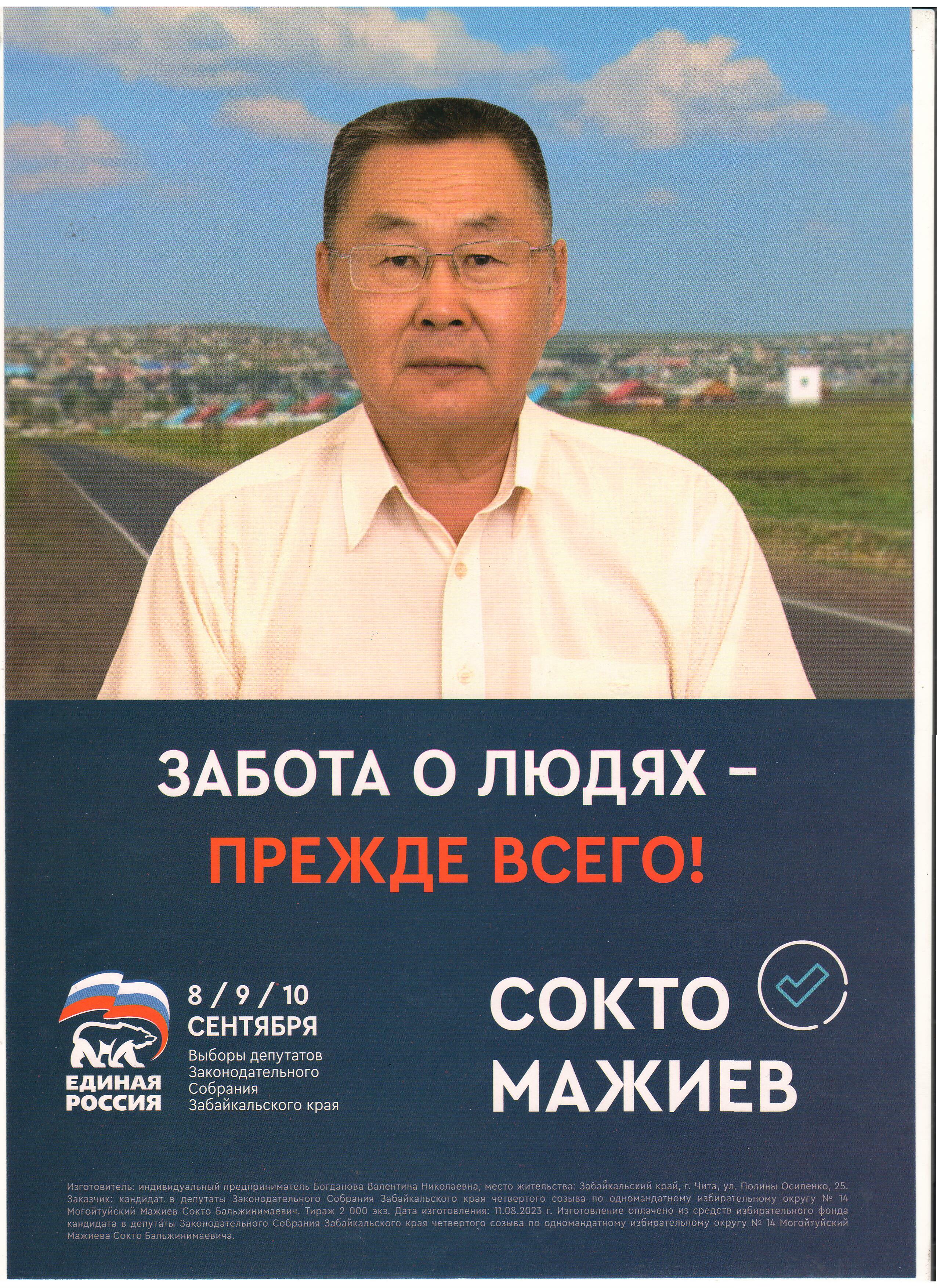 «Считаю, что польза от работы депутата может быть только тогда, когда наработаны связи с органами власти и населением, когда между всеми этими сторонами есть понимание, и они готовы конструктивно решать проблемы вместе. При этом миссия депутата — помогать людям, обратившимся к нему с проблемами. Они же поверили нам, избрали нас: только благодаря выбору людей кто-то становится депутатом, главой поселения или района. И давать пустых обещаний в этом случае нельзя, поскольку люди всегда чувствуют фальшь», — считает кандидат в депутаты Законодательного собрания Забайкальского края Сокто Бальжинимаевич Мажиев.