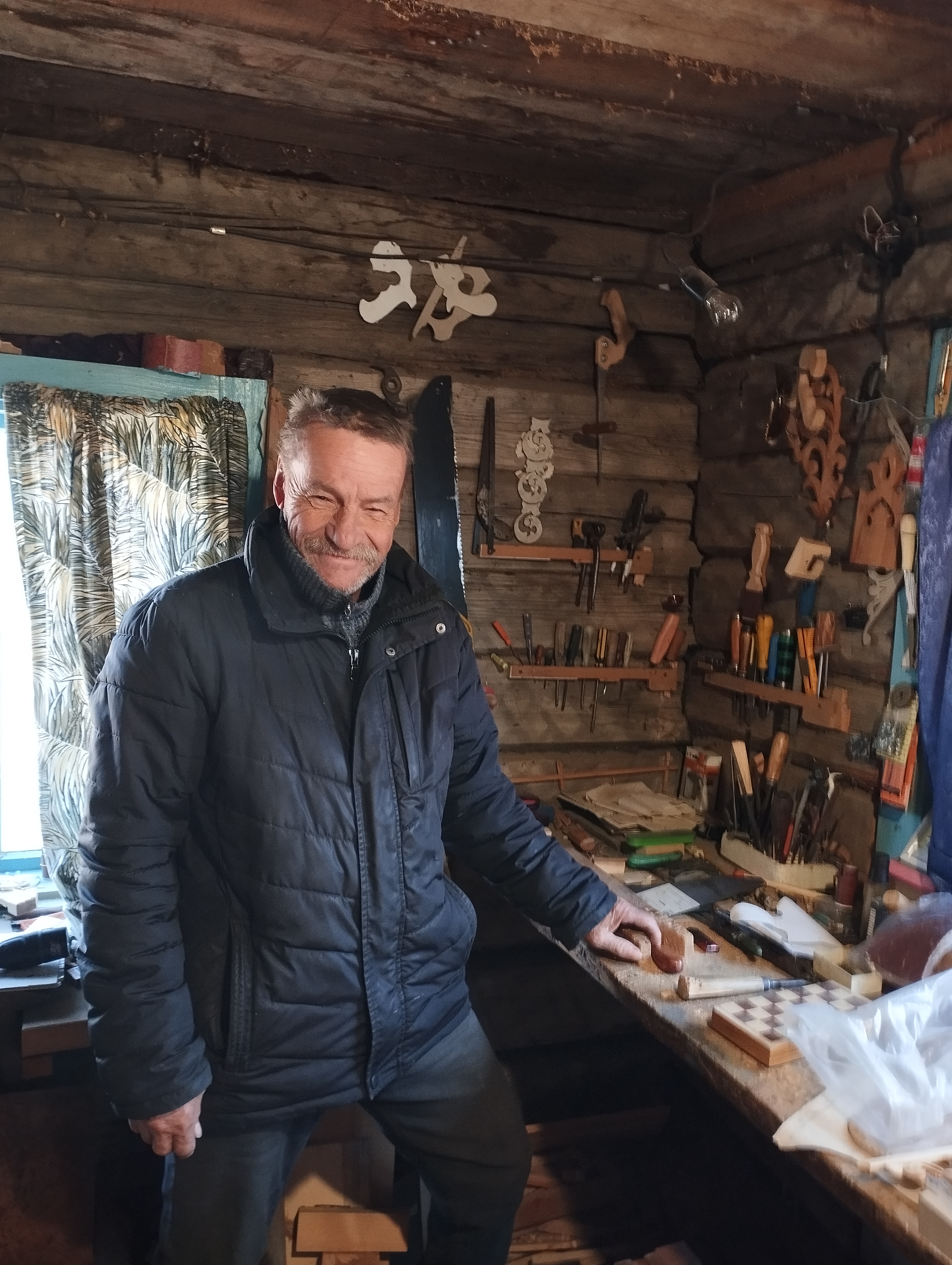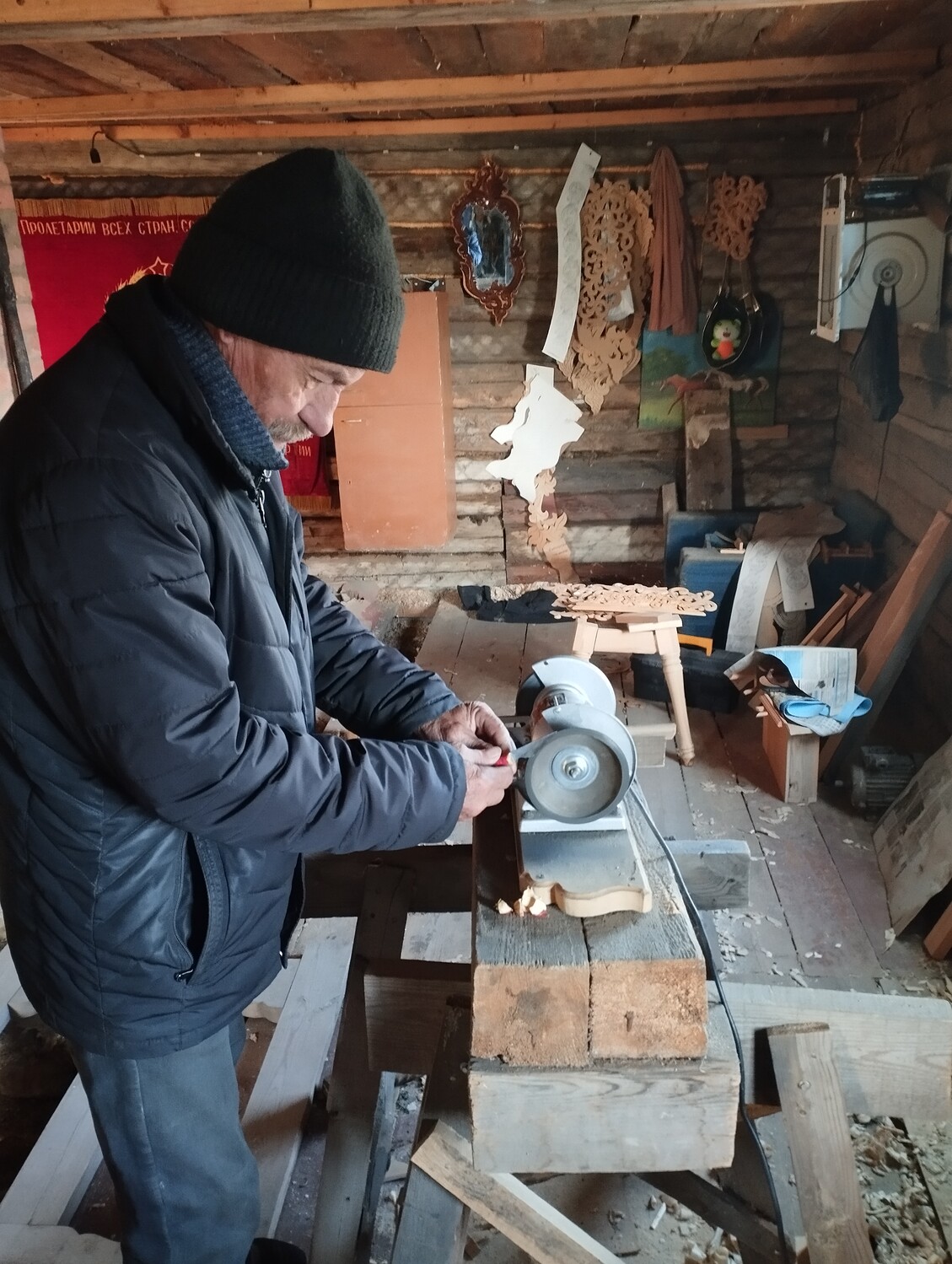Мастерской оказался тепляк, где был творческий беспорядок. Нас этим не удивишь и не напугаешь – видели много мастеровых, у которых всегда хаос творчества. Посмотрев резные заготовки под гунгарбу (божница), шаблоны, лекала, груду разного инструмента, понял, что дядя Саша – уникум, прирождённый талант. Не хочу обидеть своего дядьку столяра, но справедливости ради отмечу, что он и рядом не стоит с Александром Николаевичем по уровню мастерства. Дядёк мой ремесленник, а Александр Маслов – творец. Этим всё сказано.