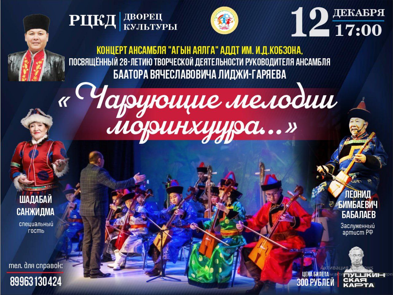 12 декабря в 17.00 часов в Агинском РЦКД. У каждого народа есть свои инструменты, в звучании которых можно услышать его душу. Одним из таких инструментов для бурятского народа является морин-хуур. Долгое время мы наслаждались чарующими звуками морин-хуура исключительно в исполнении именитых артистов нашего прославленного театра «Амар сайн» Леонида Бабалаева и Жаргала Бадмацыренова. Но три года назад в Агинском Доме детского творчества появился ансамбль моринхуристов «Агын аялга», который за это время покорил не только сердца зрителей, но и завоевал высшие награды престижных конкурсов.