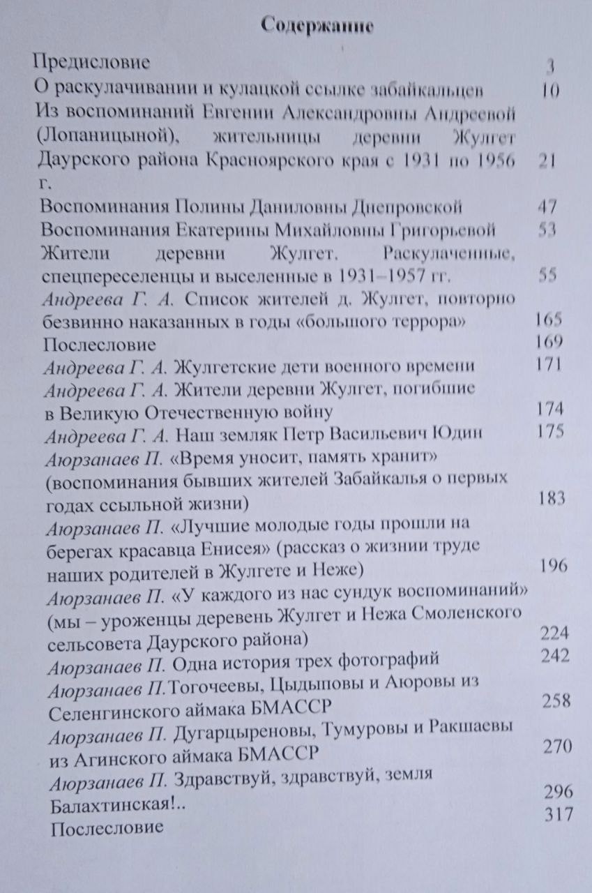 Книга содержит воспоминания сосланных летом 1931 года, круглый год трудившихся сначала в неуставных артелях ГУЛАГа, потом в колхозах. В деревнях Жулгет, Нежа, Сухонаково и других в составе Смоленского сельсовета жили и трудились в большинстве своём выходцы из Читинского, Титовского, Улетовского, Акшинского, Хилокского районов тогда Восточно-Сибирского края с центром в Иркутске (сейчас Забайкальского края), из Агинского, Селенгинского и Кяхтинского аймаков БМАССР.