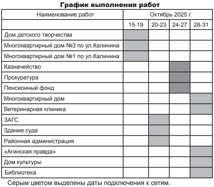 Сложившаяся ситуация находится на особом контроле министерства ЖКХ, энергетики, цифровизации и связи Забайкальского края и прокуратуры Агинского района. Администрацией городского округа «Поселок Агинское» ведется претензионная работа, утвержден новый график выполнения работ. В соответствии с утвержденным графиком выполнения работ подключение многоквартирных домов № 1 и № 3 по ул.Калинина и Агинского дома детского творчества запланировано до 20 октября 2025 года.