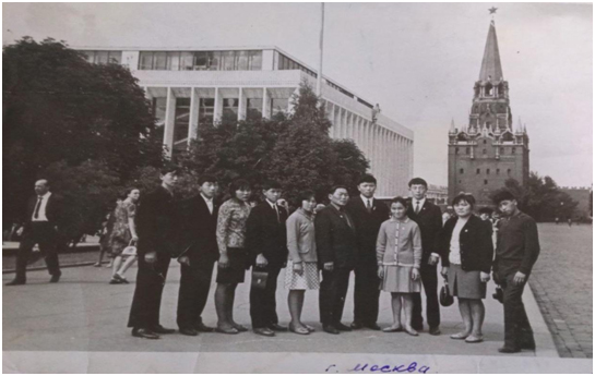 Тогда крепким был союз школы и колхоза им.К.Маркса. По первому зову правления старшеклассники шли на подготовку к зимовке общественного скота осенью, весной на очистку кошар, с наступлением лета - на стрижку овец. Организовывалась ученическая производственная бригада, и в 1967 или 1968 году под руководством учителя математики Р.Ж.Жундуева за высокие производственные результаты ученическая производственная бригада получила бесплатную путёвку на ВДНХ в Москве. Член бригады Б-Б.Мункуев (на снимке крайний справа) за рекордный настриг шерсти с 1108 голов овец за сезон награждён медалью «За освоение целинных и залежных земель». Участники бригады: Ц.Будаева, Р-Х.Цыренова, Я.Чимитова, Б.Галсанов, Б.Баранзаев, Б-С.Балданов, Р.Цыдендоржиев.