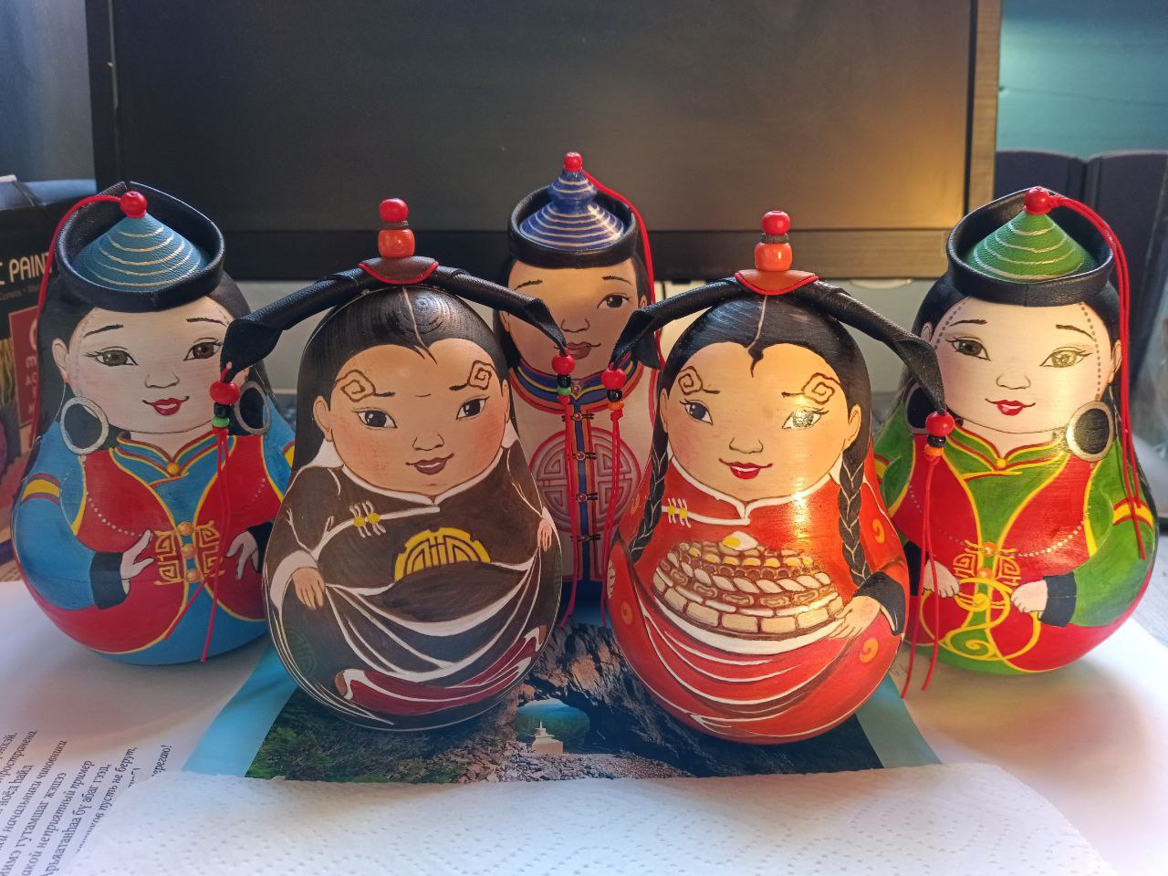 Мои братья Жамьян и Тумэн, как и отец, увлекаются резьбой по дереву, ковкой металла. Мама передала нам, своим трем дочерям, искусство шитья, вязания, обработки кожи и меха. Туяна известна своими ювелирными изделиями, сувенирами в национальном стиле, ее коллекции одежды стали лауреатами «Алтарганы» 2020 и 2024 годов. Оюна занимается созданием изделий из натуральной шерсти, сувениров, увлекается вязанием. Она первый обладатель Гран-при из Аги, края Всероссийского конкурса «Туристический сувенир» в г.Нижний Новгород. По маминой линии тетя Долгорханда-абгай Будаева очень талантливо, хорошо рисует. В детстве я часто наблюдала, как она оформляла панорамными рисунками стены в сельском Доме культуры, потихоньку знакомилась с красками и кистью.