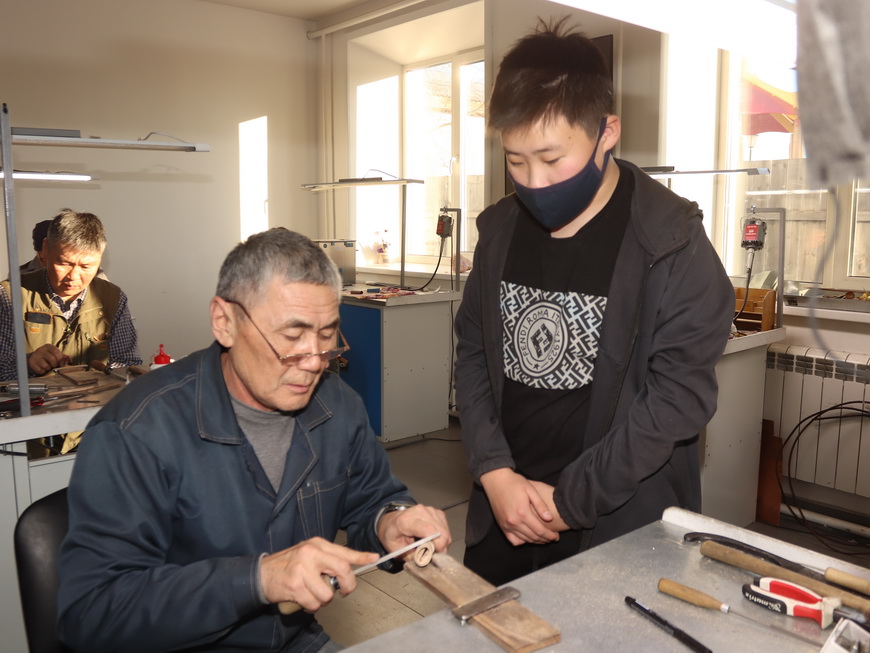Рядом с юным Айдаром в мастерской сосредоточенно трудились и другие курсанты, подготовлено восемь рабочих мест с различными инструментами. В школе-мастерской работают около десяти мастеров, у каждого своя работа. Это Баяр Батодоржиевич Баясхаланов, мастер лучного дела, Будажаб Балданжамсоевич Нашинов, Александр Цыдыпович Дариев - мастера-преподаватели оружейного дела, мастера-ювелиры Гыпыл Дондокович, Зорикто Мижитдоржиевич, также Амгалан Цыденович, сборщик ножей, и другие сотрудники, которые проводят различные мастер-классы, в частности, по оружейному делу, гончарному ремеслу, кузнечному мастерству и ювелирному делу.