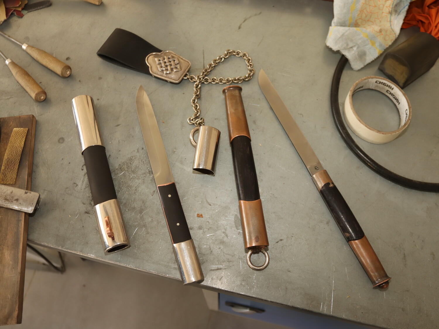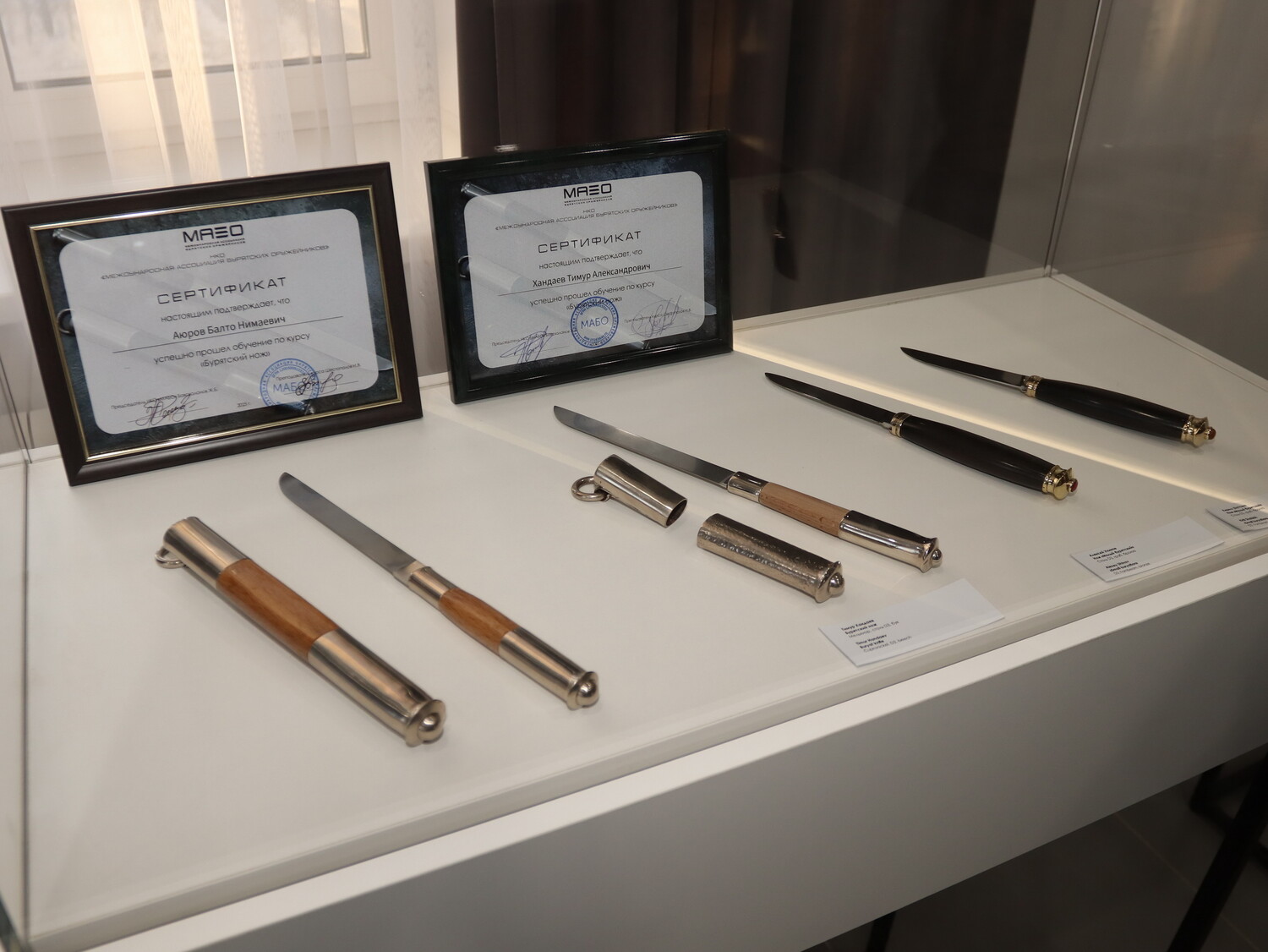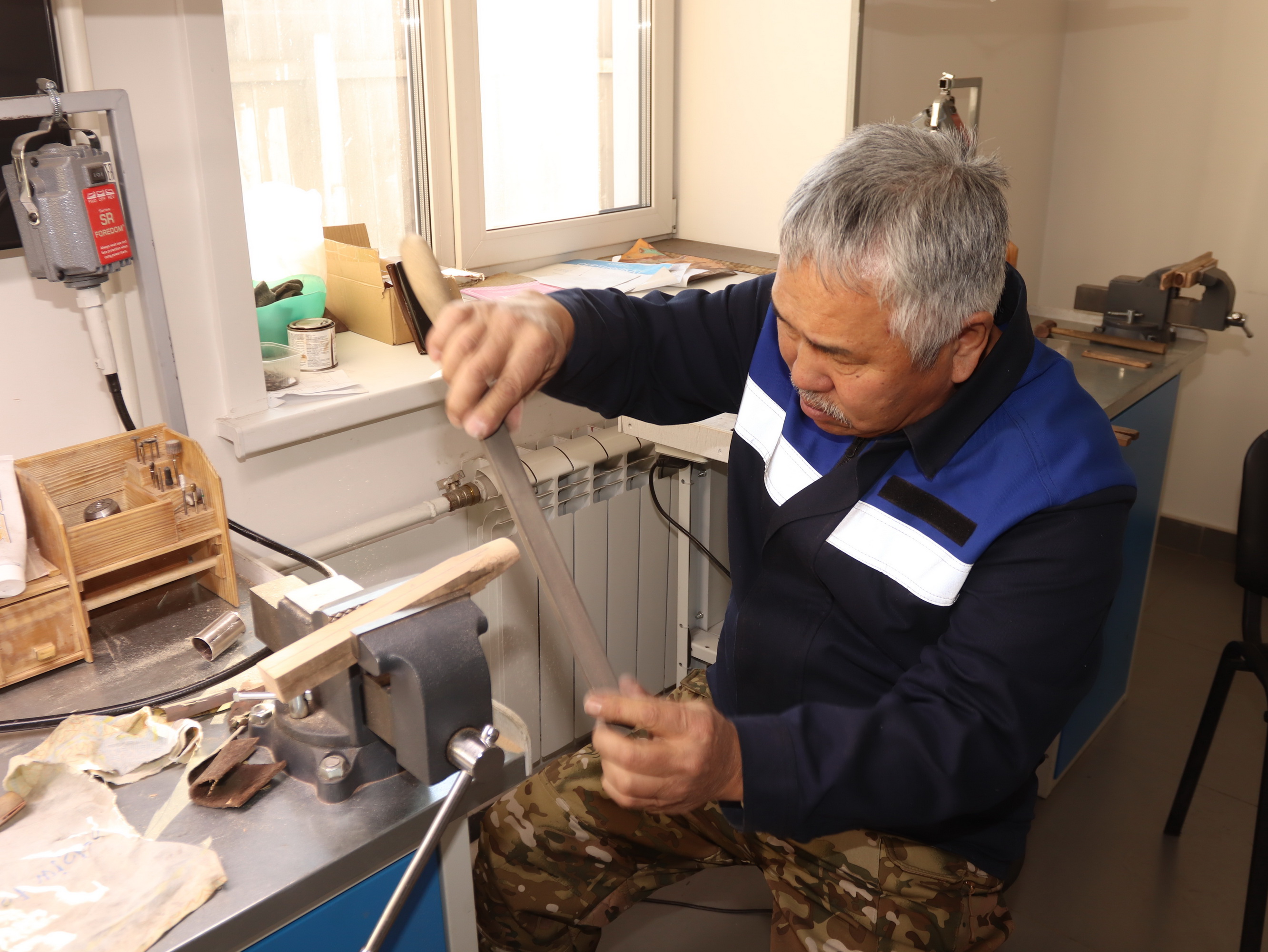 У курсантов готовы клинки, и будущим мастерам осталось сделать ножны для своих ножей. На вопрос, откуда и почему появился интерес к оружейному делу, он ответил, что здесь работает мастером его друг, бывший коллега Будажаб Нашинов, и они вместе занимаются в МАБО. Учебой он доволен, рассказывает, какие в мастерской стоят отличные станки, да и мастера-преподаватели прекрасные. Мастер Будажаб Нашинов, выпускник курсов, теперь сам преподает новичкам азы оружейного дела.