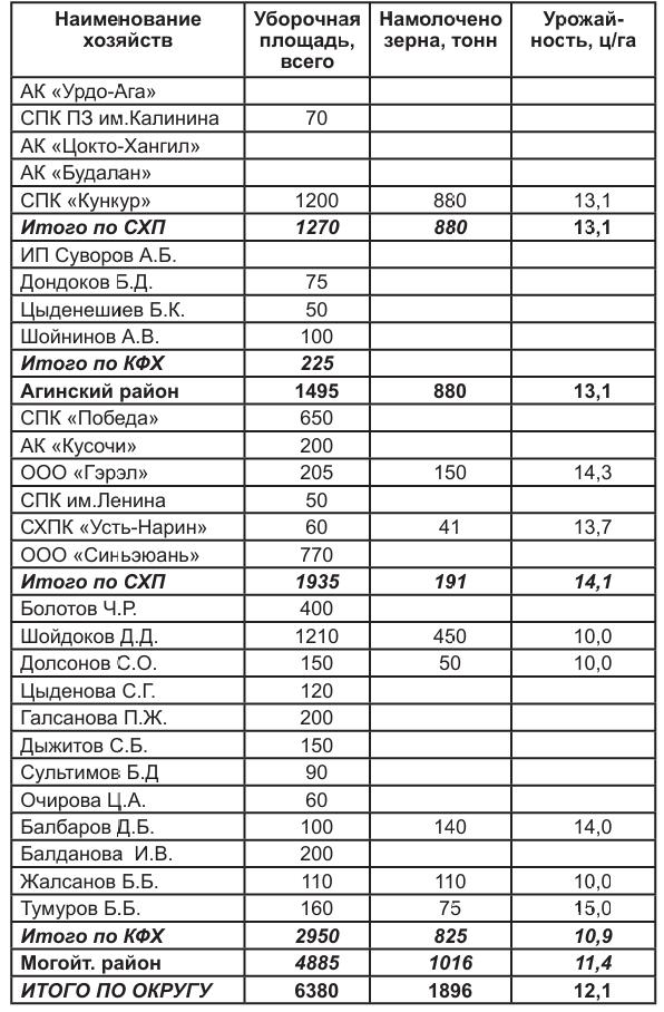 Уборочная площадь зерновых культур по Агинскому округу в 2025 году составляет 6380 га, скошено 2350, обмолочено 1565 га, намолочено пока 1896 тонн зерна, средняя урожайность составляет 12,1 центнера с гектара. 880 тонн зерна намолотили кункурцы, 450 – ООО «Шойдоков» из Ортуя, 150– кусочинцы, 140 тонн – КФХ Д.Б.Балбарова. Из-за снега многие поля полегли, тем не менее, механизаторы стараются убрать все посевные площади.
