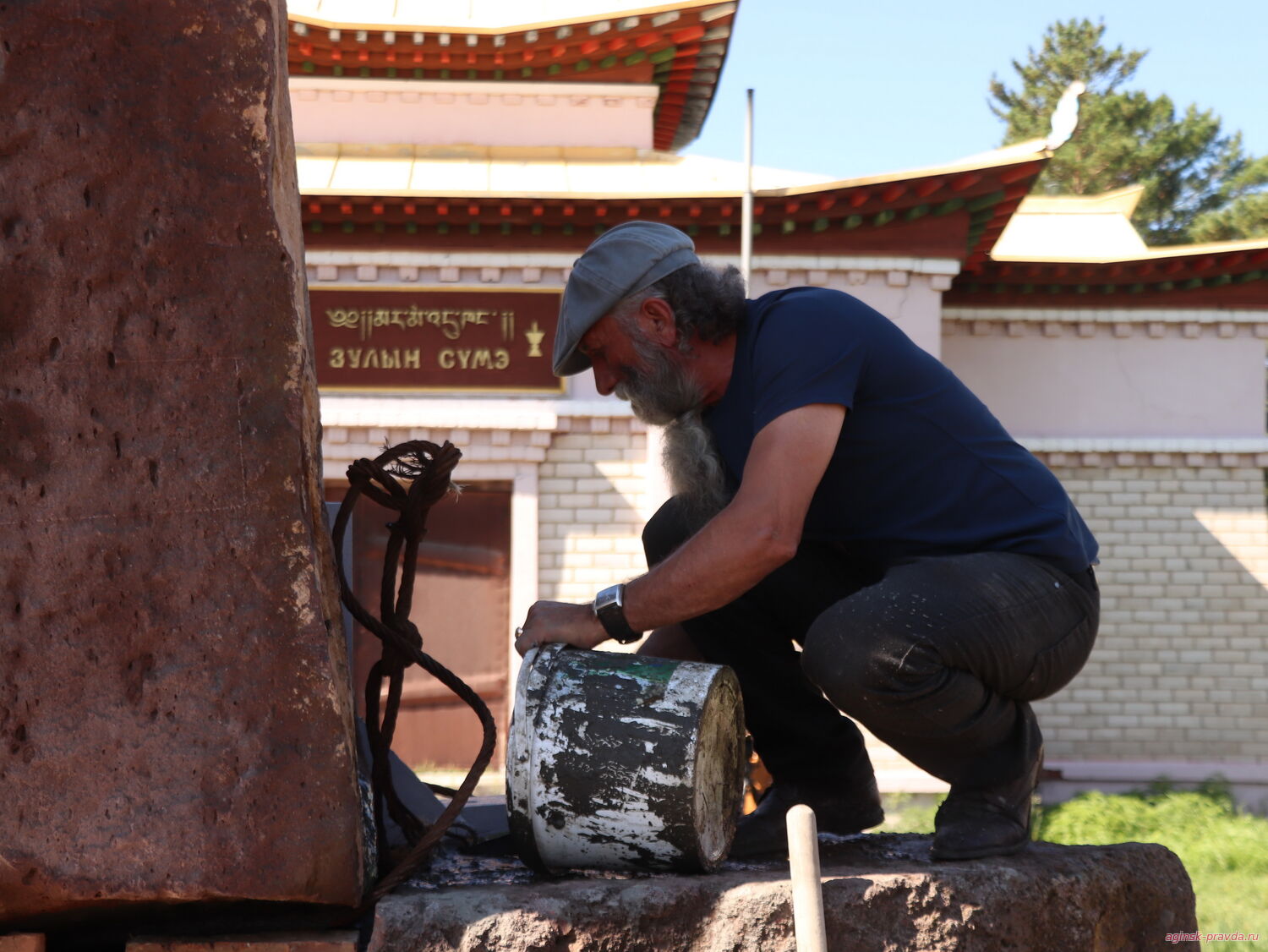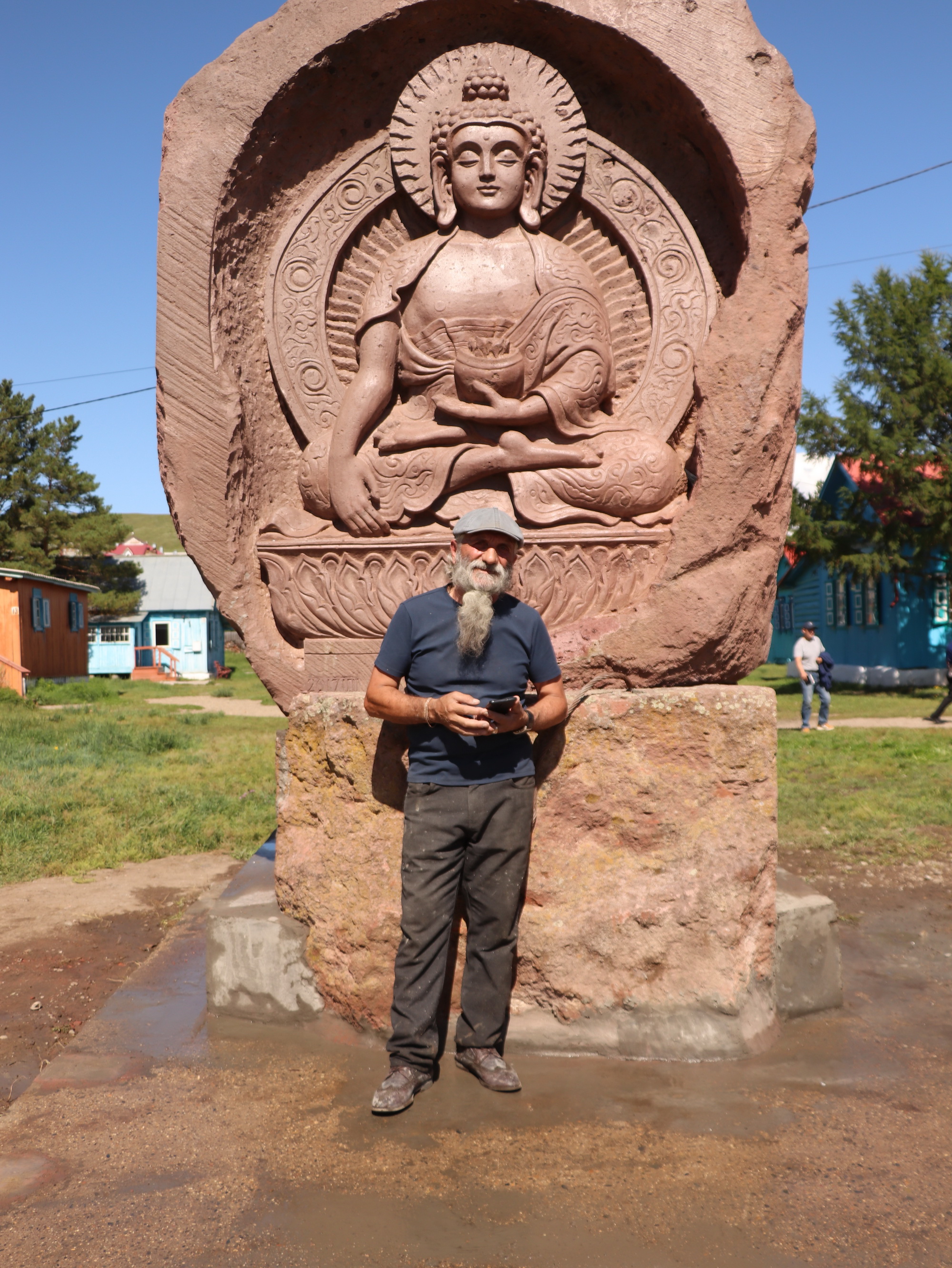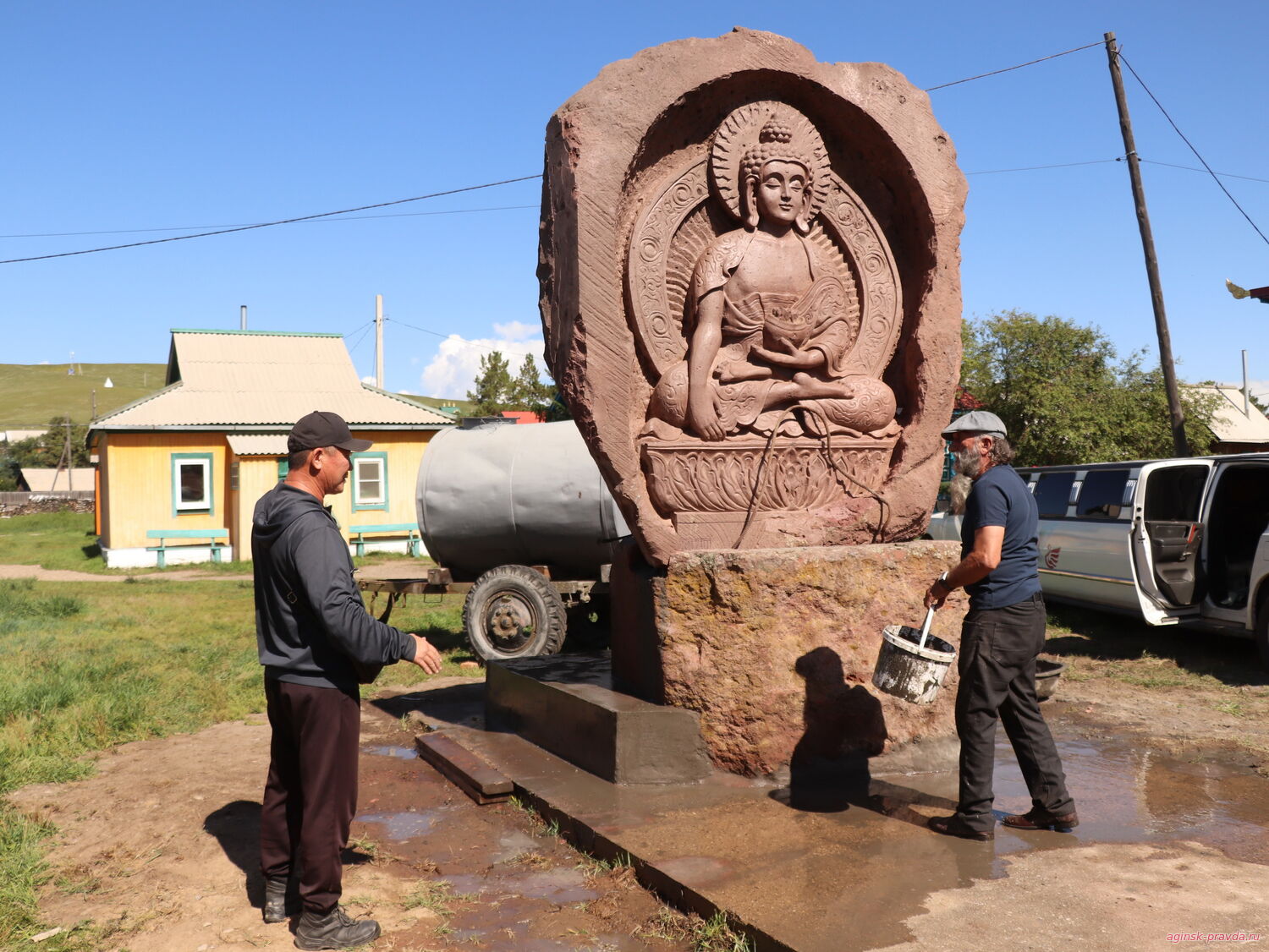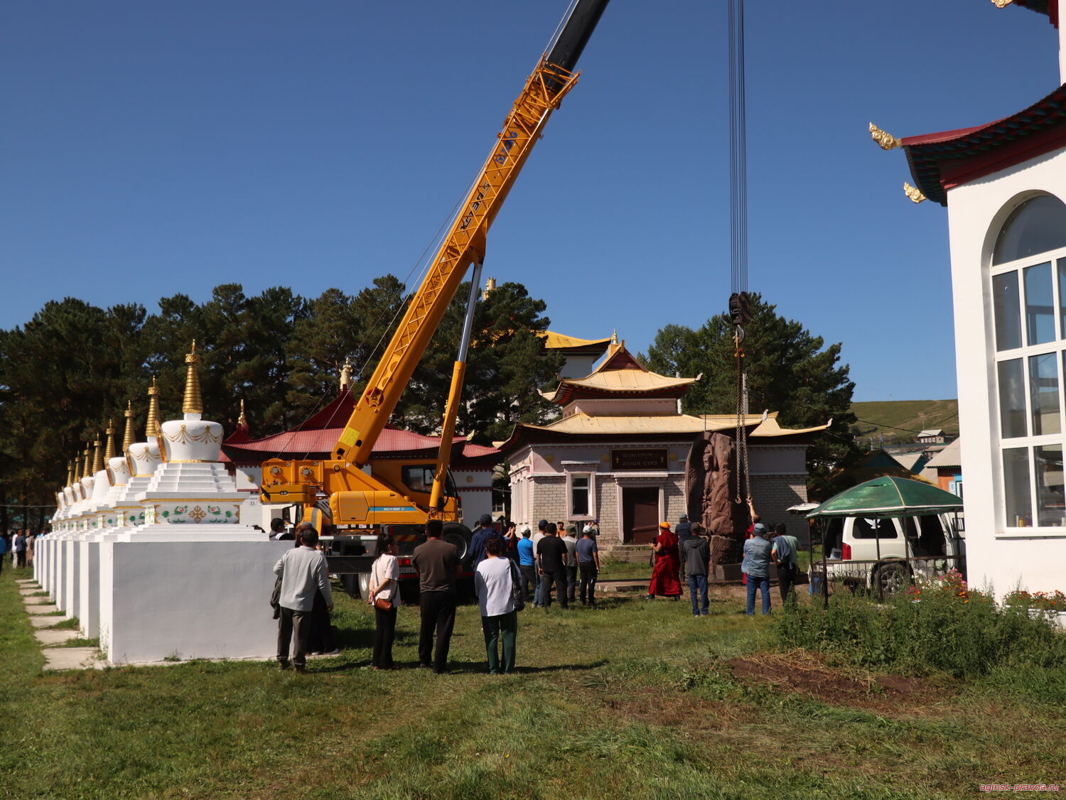 В первой половине дня 25 августа нам позвонили, и мы выехали в Агинский дацан, где заканчивали установку 12-тонной статуи Будды, привезенной из Армении.