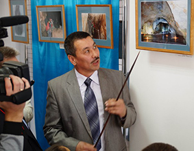Затем фотограф-спасатель провел небольшую экскурсию по залу, давая собравшимся небольшие пояснения к каждому из снимков. Надо сказать, здесь было на что посмотреть: вот карьер Новоорловского горно-обогатительного комбината, снятый с высоты птичьего полета, а точнее - с телевизионной вышки поселка Орловский, высота которой составляет 240 метров. Снимок был сделан во время подъема оборудования, обеспечивающего цифровое вещание на территории округа, которое поднимали на телевышку с помощью альпинистского снаряжения.